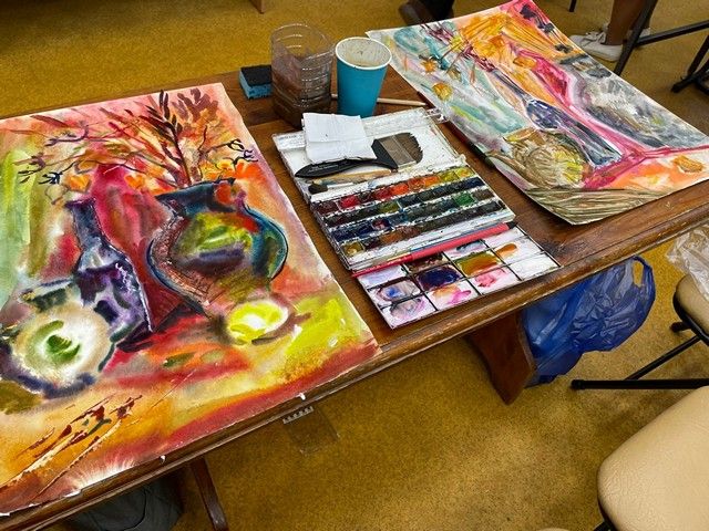 Все преподаватели работали с натуры, без подготовительного рисунка, стараясь передать тёплую гамму натюрморта с цветами и фруктами по сырому листу. И.В.Ловцова показала оригинальные приёмы в работе акварелью. Эта интересная техника позволяет получить эффективный результат при минимальных затратах времени.