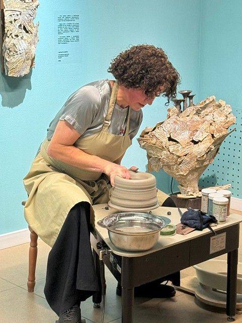 Главным событием вечера стал живой перформанс: прямо на глазах у гостей Олеся создала на гончарном круге большую глиняную тарелку. Завершили произведение юные художники из детской художественной школы, которые тут же, вдохновившись, украсили сырую глину росписью. В процессе работы Олеся Андреева отвечала на вопросы зрителей, раскрывая секреты своего метода и тонкости диалога с материалом.