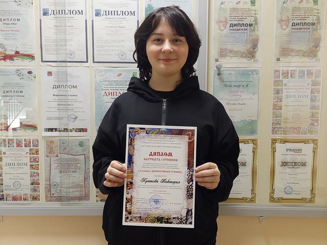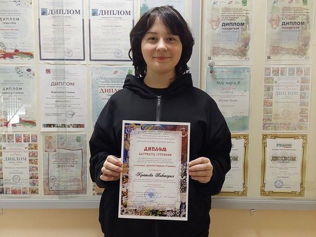 1. Кривцова Анастасия (17 лет), номинация «Живопись», работа «Накануне Нового года», лауреат 2 степени (преподаватель Харитонова Галина Николаевна), номинация «Декоративно-прикладное творчество», работа «Очарование осени», лауреат 3 степени (гобелен, ручное ткачество; преподаватель Котлярова Ирина Владимировна);